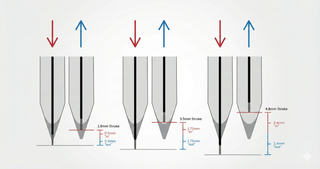 ※この図は、針の出し代をストローク幅の「中央」に設定した状態です。実際には針を長く出す(OUTを増やす)と、その分チューブ内への戻り(IN)は浅くなります。